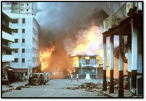 The US invasion had also afforded the US military the opportunity to test its newly developed Stealth Bomber on Panama’s most vulnerable population. As media-watch group Fairness and Accuracy in Reporting (FAIR) noted at the time, Operation Just Cause saw the impoverished Panama City neighborhood of El Chorrillos pulverized to the point of being referred to by ambulance drivers as “Little Hiroshima.” Hundreds and possibly thousands of civilians were killed. It was estimated that the invasion left 14,000 people homeless.
